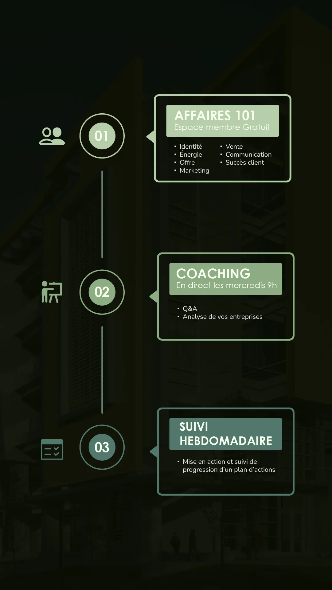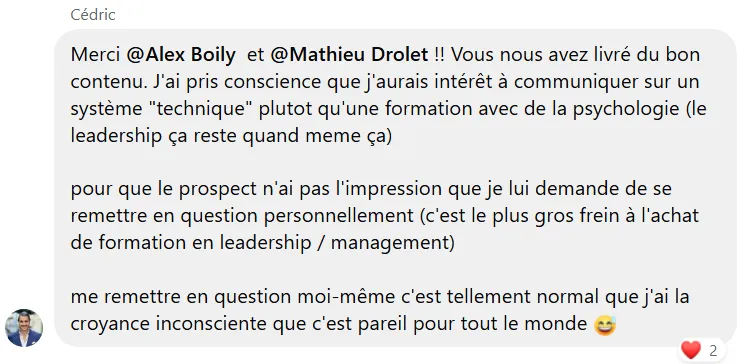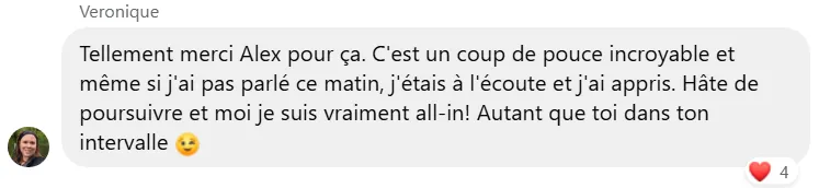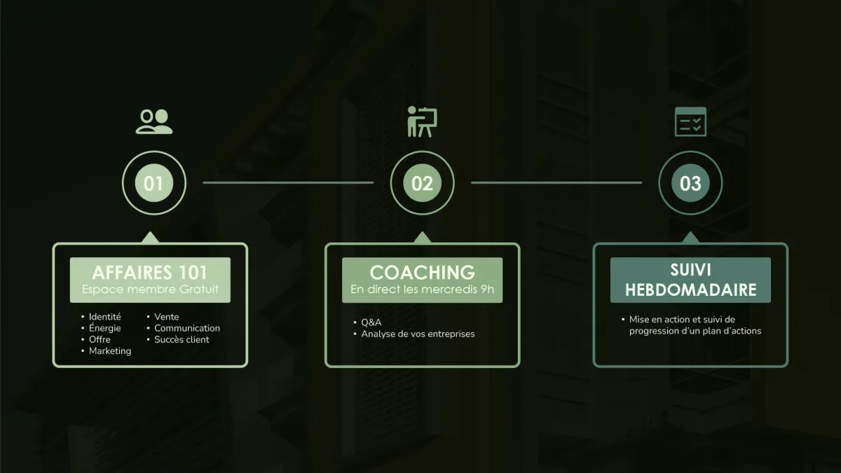 Au travers des coachings hebdomadaires, je te recommanderai l’un où l’autre module selon ta situation, c’est l’endroit idéal pour trouver des solutions pertinentes à ton entreprise.