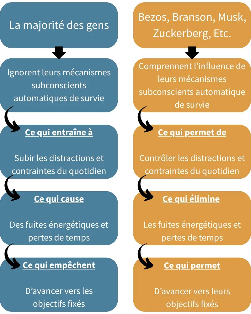 Nous libérons plusieurs heures de notre agenda en répliquant les mêmes stratégies que Branson, Musk, Bezos et plusieurs autres… ont utilisées à leur début pour contrôler les fuites énergétiques menant à la surcharge mentale et à la perte de temps, sans nécessairement devoir utiliser des clichés comme déléguer ses tâches.