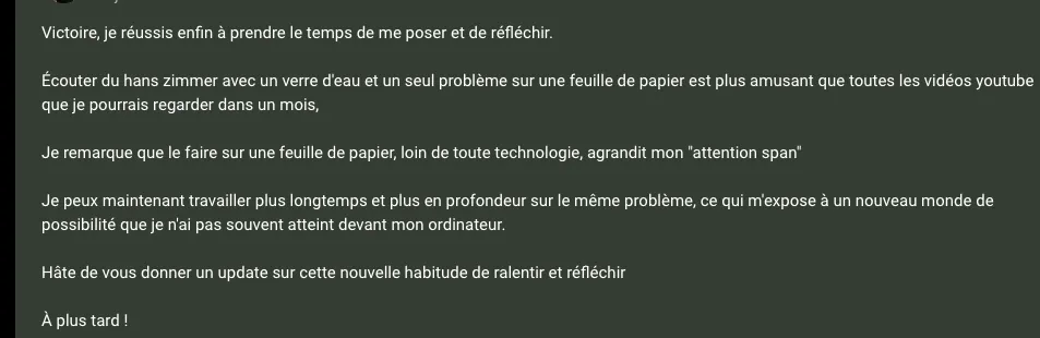 Ce temps maintenant libre permet de construire son entreprise, d'améliorer sa santé, d’être un parent plus présent… Bref, poursuivre les objectifs que l’on a tendance à continuellement repousser.